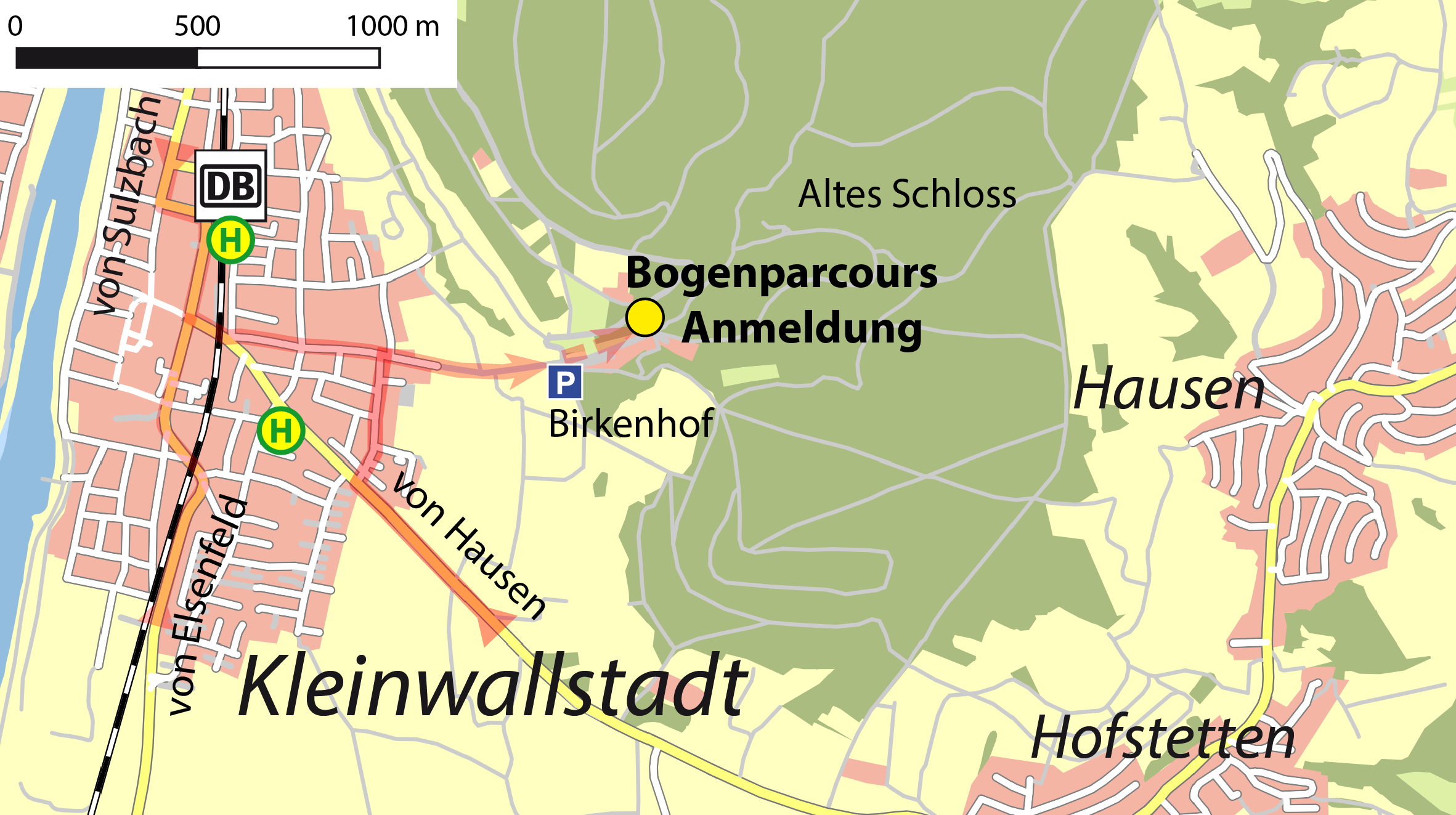 Folgen Sie in Kleinwallstadt der Beschilderung nach Hofstetten und biegen Sie kurz nach dem Bahnübergang halblinks in die Schloßstraße ein und folgen dieser. Von Hofstetten und Hausen kommend biegen Sie gleich am Ortseingang Kleinwallstadts rechts in die Friedhofstraße ein und nach ca. 300m wieder rechts in die Schloßstraße.